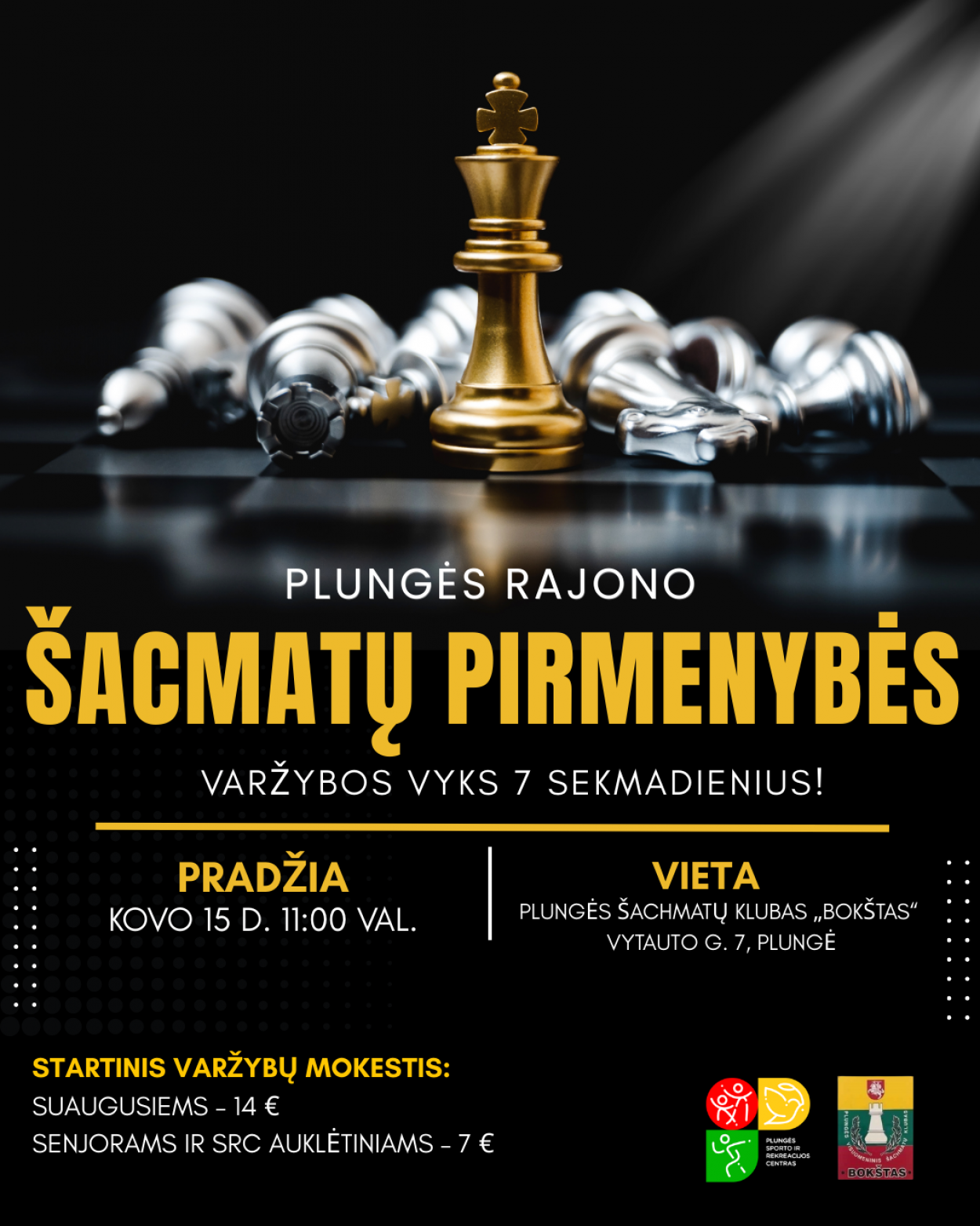Plungės rajono šachmatų pirmenybių varžybos pradedamos 2026 m. kovo 15 d. (sekmadienį) 11.00 val. Plungės visuomeniniame šachmatų klube „Bokštas”, adresu Vytauto g. 7, Plungėje. Dalyvių atvykimas ir registracija varžybų vietoje – iki 10.45 val. Varžybų atidarymas – 11.00 val., iškart po atidarymo – I ratas. Varžybas numatoma vykdyti 7 sekmadienius.